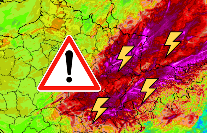 Avec une chaleur torride mais également l'arrivée d'un talweg par le golfe de Gascogne, tous les ingrédients seront réunis pour que des orages très violents éclatent. Les premières cellules vont se former dès le début de l'après-midi dans le centre de la France, prenant rapidement la direction du nord-est d'ici à la fin de journée. Ces orages s'annoncent plus virulents sur la Bourgogne-Franche-Comté, la Lorraine et l'Alsace où l'on redoute de gros grêlons et des rafales de vent localement destructrices. Puis, une seconde vague orageuse devrait remonter dans la nuit de Midi-Pyrénées en direction de la région Rhône-Alpes. Là aussi, gros grêlons (plus de 5 cm de diamètre) et rafales de vent tempétueuses sont à craindre.
