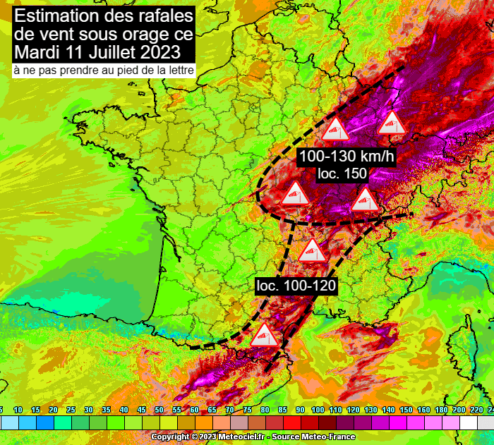 Rafales de vent envisagées par le modèle AROME ce mardi 11 juillet 2023 – via meteociel.fr