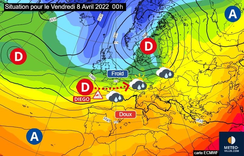Les basses pressions deviennent de plus en plus dynamiques entre le nord de l'Atlantique et la Scandinavie. Ces prochains jours, l'anticyclone se situera à proximité sur l'Espagne. C'est donc un courant océanique qui domine sur une bonne partie de l'Europe. Toutefois, ce dernier est associé un important conflit de masses d'air. L'air froid englobe les Îles Britanniques et la Mer du Nord tandis que l'air doux remonte sur l'Espagne et le sud de la France. Ce choc de masses d'air va favoriser la formation de la tempête Diego.