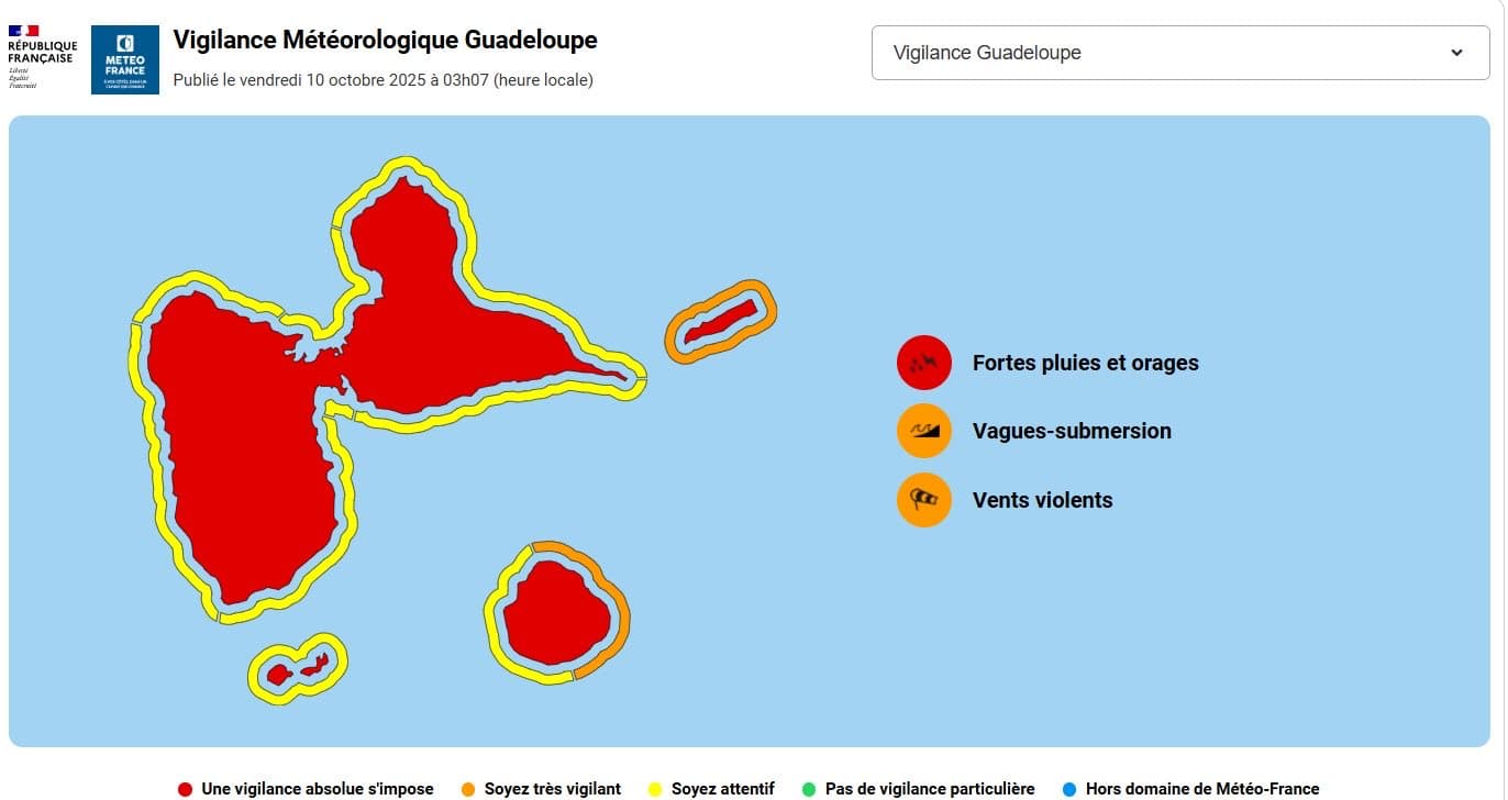Vigilance rouge fortes pluies et orages sur la Guadeloupe ce vendredi 10 octobre 2025 – Météo-France