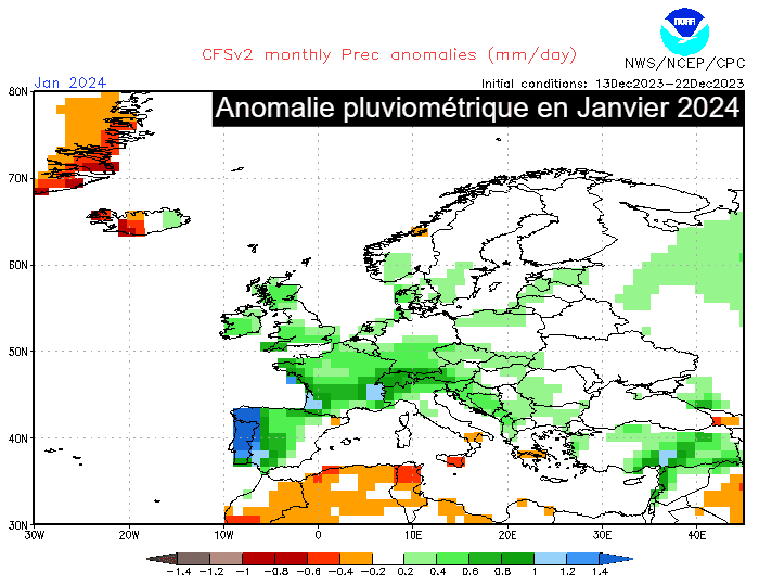 Anomalie pluviométrique envisagée en Europe au mois de janvier 2024 - carte NOAA