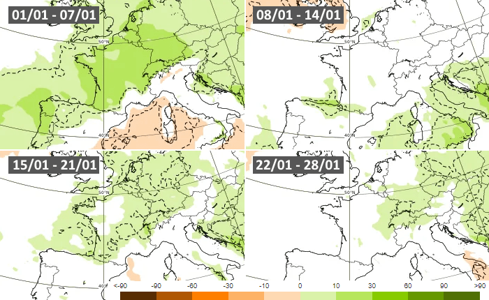 D'une manière générale, un signal humide se dégage pour ce mois de janvier 2024. Cette pluviométrie excédentaire concernerait surtout l'ouest de l'Europe, notamment le Portugal, l'Espagne, les Îles Britanniques, la France, le nord de l'Italie, la Suisse, l'Autriche et le sud de l'Allemagne. À l'inverse, des signaux plus secs ressortent sur le nord-ouest du continent, notamment sur l'Islande (en lien avec de hautes pressions récurrentes sur le Groenland).