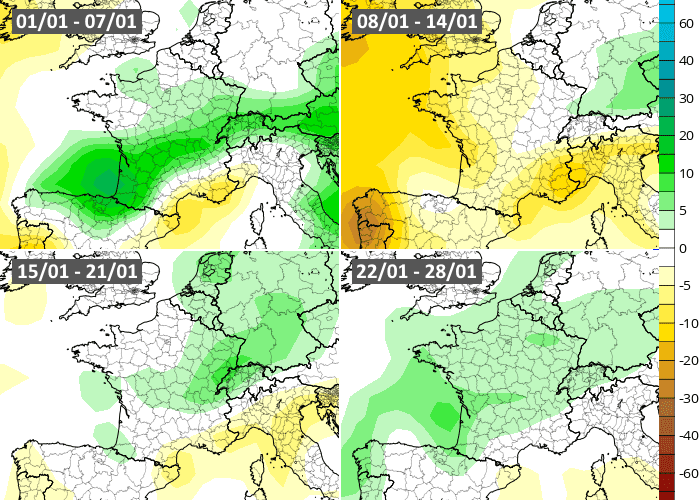 Comme le scénario du modèle américain, celui du modèle européen envisage un début de mois de janvier instable avec de fréquentes précipitations, sauf sur les régions méditerranéennes. La semaine du 8 au 14 janvier pourrait être plus classique (sans réelle anomalie envisagée) avant la reprise d'un temps plus humide entre le 15 et le 21 janvier. Pour la fin du mois, il n'y a pas de scénario clair qui se dégage concernant la pluviométrie.