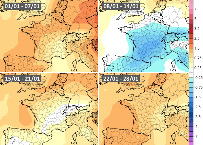 Le modèle européen propose un scénario similaire avec une première semaine de janvier 2024 dominée par la douceur océanique. Comme son homologue américain, il projette une semaine du 8 au 14 janvier plus froide en France, même si le déficit thermique par rapport aux normales resterait limité. La semaine du 15 au 21 janvier est vue neutre avant le retour d'une relative douceur en dernière décade du mois.