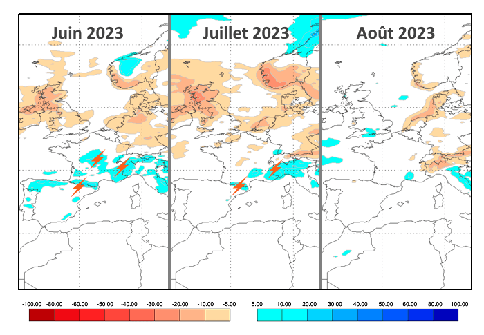 Anomalies pluviométriques en juin, juillet et août 2023 selon le modèle européen - via EFFIS