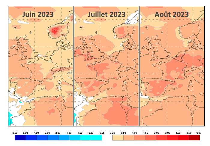 Anomalies thermiques en juin, juillet et août 2023 selon le modèle européen - via EFFIS