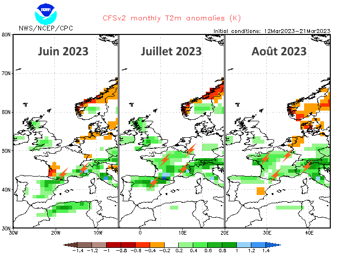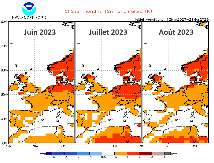 Si l'on se penche sur les projections du modèle américain pour le trimestre estival 2023, une tendance chaude se dessine. Que ce soit pour le mois de juin, de juillet ou d'août, le modèle envisage des températures supérieures à la normale en France. Notons que cet excédent semble rester raisonnable, de l'ordre de +0,5 à +1°C au cours des trois mois. Il est toutefois important de garder à l'esprit que les tendances à long terme tendent à "lisser" les anomalies et donc potentiellement à les atténuer par rapport à la réalité.