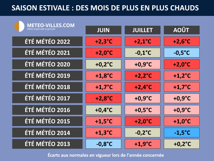 Anomalies thermiques durant les mois estivaux de 2013 à 2022 - Météo Villes