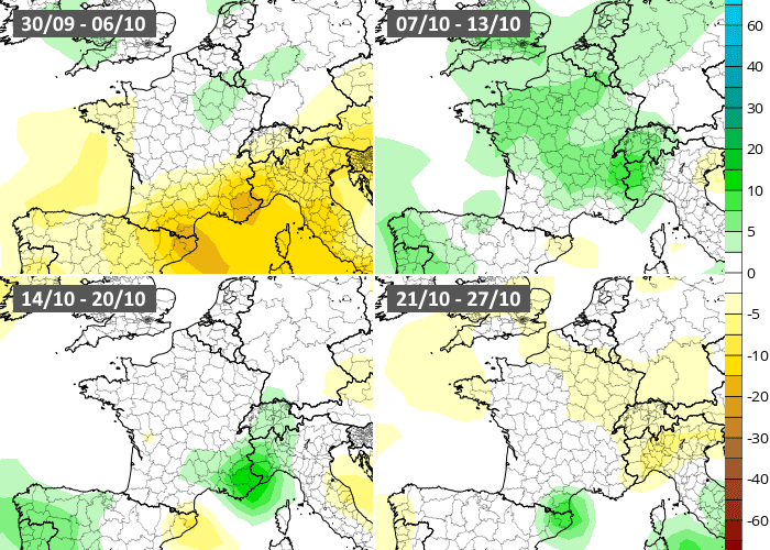Anomalies pluviométriques hebdomadaires en octobre 2024 selon le modèle européen - ECMWF