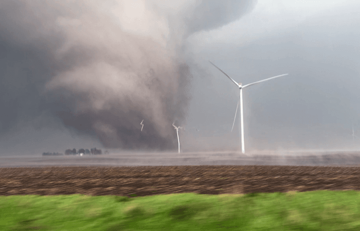 Les derniers jours ont été particulièrement orageux de l'autre côté de l'Atlantique. Plusieurs vagues orageuses virulentes ont été observées, dont la plus marquante dans l'État de l'Iowa en journée du mardi 21 mai 2024. Celle-ci fut à l'origine de violentes chutes de grêle mais aussi et surtout de plusieurs tornades, dont une particulièrement violente dans le secteur de Williamson. L'image ci-dessous, capturée par le chasseur d'orages Reed Timmer, montre la force dévastatrice de la tornade, emportant avec elle les éoliennes.