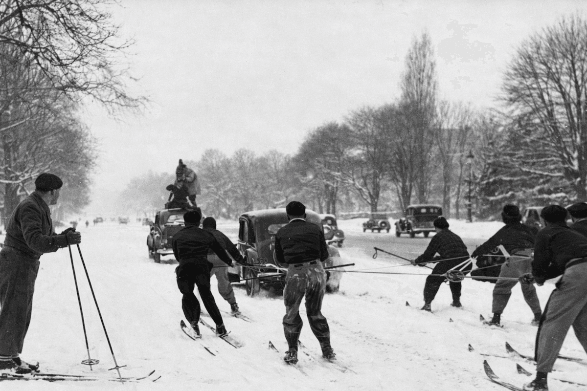 Tournage de skieurs sur l'avenue Foch à Paris, lors de la vague de froid de décembre 1938 - journal l'Illustration (collection meteo-paris.com)