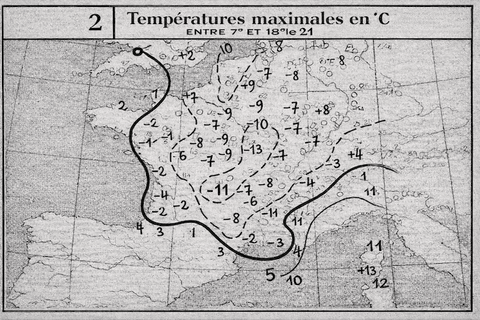 Les températures maximales extrêmement basses du 21 décembre 1938 - carte réalisée par la météorologie nationale (collection meteo-paris.com)