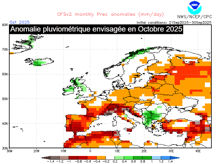 Anomalie pluviométrique envisagée en octobre 2025 - NOAA