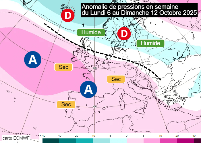 Anomalie de pressions en semaine du lundi 6 au dimanche 12 octobre 2025 - ECMWF