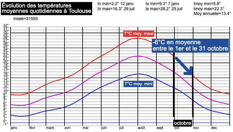 Enfin, si les températures nocturnes et diurnes peuvent encore atteindre des niveaux de plein été au début du mois d’octobre, ce n’est plus le cas en seconde partie car l’automne s’installe beaucoup nettement. Le soleil est en effet de plus en plus bas, et les descentes froides sont de plus en plus fréquentes (notamment parce que la nuit polaire s’installe peu à peu autour de l’Arctique). A Paris, on perd en moyenne 5,5°C entre le début et la fin du mois d'octobre et 6°C à Toulouse.