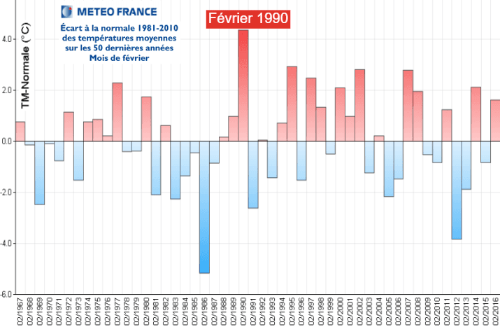 Anomalies de températures en février entre 1967 et 2016 sur la France – Météo-France