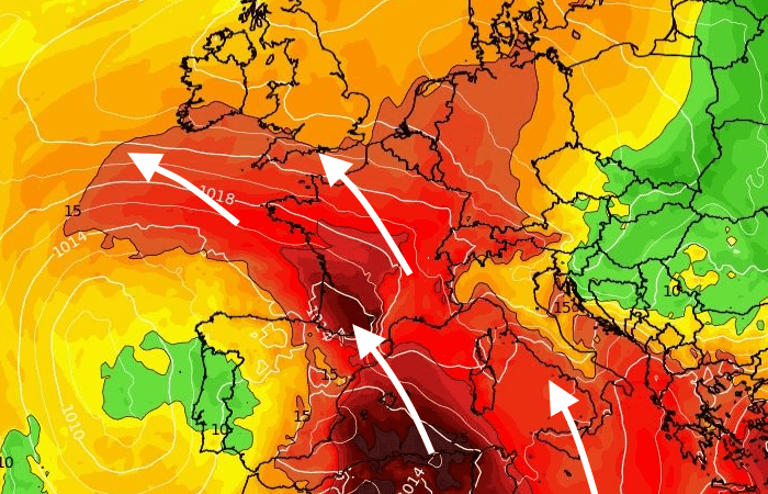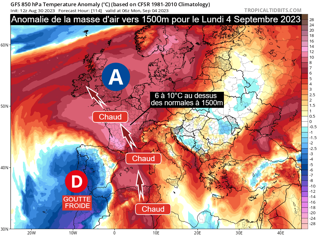Avec une goutte froide sur le Portugal et le renforcement d'un anticyclone sur les Îles Britanniques et la Mer du Nord, tous les ingrédients seront réunis pour faire remonter l'air chaud nord-africain directement au dessus de la France avec un réchauffement très net de la masse d'air durant ce week-end des 2 et 3 septembre 2023. La chaleur pourrait culminer en début de semaine prochaine avec des valeurs 6 à 10°C au dessus des normales vers 1500 mètres au dessus de la France, autorisant de fortes chaleurs au sol sur un certain nombre de régions (pas seulement au sud).
