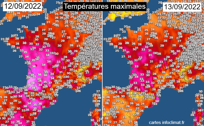 Températures maximales des 12 et 13 septembre 2022 - cartes infoclimat.fr