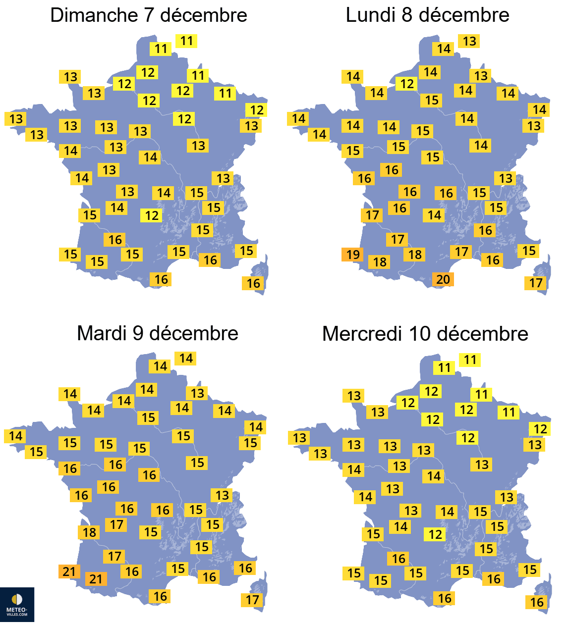 Températures maximales envisagées sur la France entre le 7 et le 10 décembre 2025 – Météo-Villes