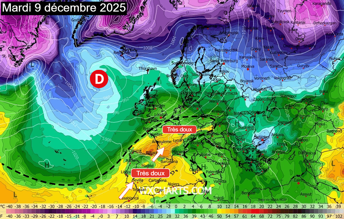 Douceur proche des records à 850 hPa sur la France envisagée pour le 9 décembre 2025 – PolarWX