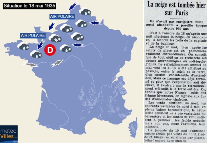 Comme nous l'avons vu plus haut, une dépression s'est creusée sur le nord-ouest de la France les 17 et 18 mai 1935, aspirant de l'air polaire et apportant des précipitations actives qui ont stationné entre la Bretagne et la Normandie. Après de fortes pluies en fin de journée du 17 mai, l'effet d'isothermie a apporté des chutes de neige jusqu'en plaine durant la nuit suivante et jusqu'en matinée du 18 mai entre l'est de la Bretagne et l'Île-de-France. Des flocons sont signalés à Rennes et 3 cm de neige tombent à Paris où la ville se réveille sous un manteau blanc !