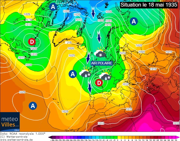 Même si le terme de "vague de froid" perd un peu de son sens au cours du mois de mai, il fut utilisé pour qualifier l'épisode de froid anormal qu'a subi la France entre le 14 et le 20 mai 1935. Il y a 86 ans, une puissante dorsale anticyclonique s'étirait des Açores jusqu'au Groenland, faisant plonger plusieurs anomalies dépressionnaires du pôle en direction de la France, emportant avec elles un air d'origine polaire.