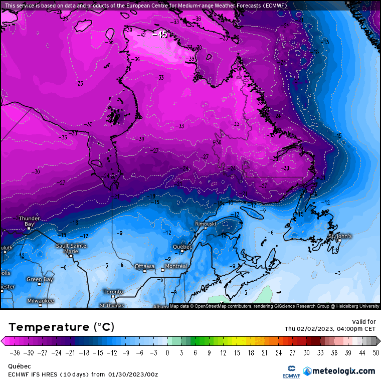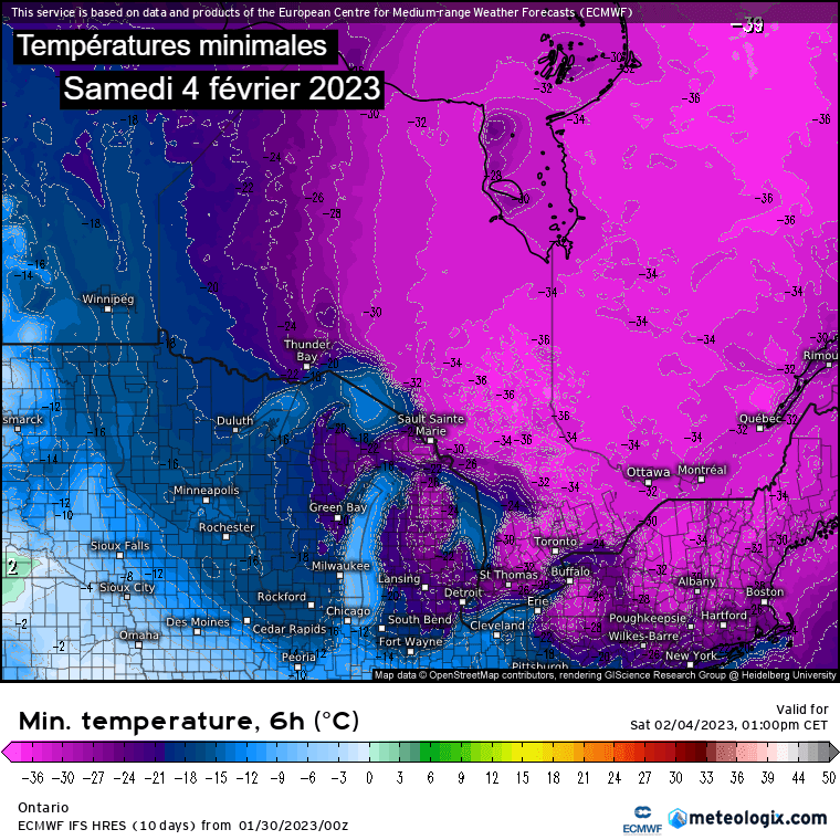 C'est notamment la journée de samedi 4 février qui devrait s'avérer comme la plus froide de la période avec des minimales s'approchant des -30°C du côté de Toronto pour un record de -32,8°C le 10 janvier 1859, autour de -28/-30°C du côté de Montréal (record de -37,8°C le 15 janvier 1957).