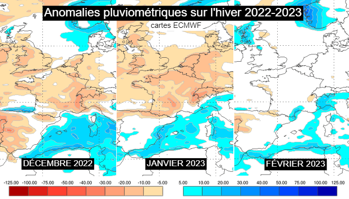 Anomalies pluviométriques mensuelles pour l'hiver 2022-2023 - modèle européen via ECMWF