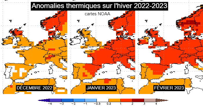 Anomalies thermiques mensuelles pour l'hiver 2022-2023 - modèle européen via ECMWF