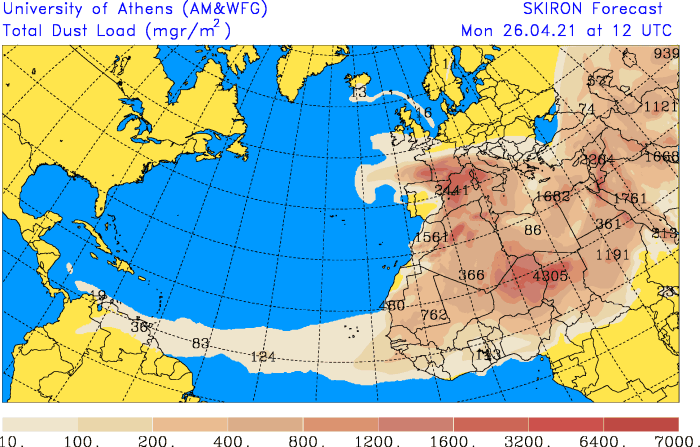 Prévisions de la quantité de sable pour le lundi 26 avril 2021 - SKIRON