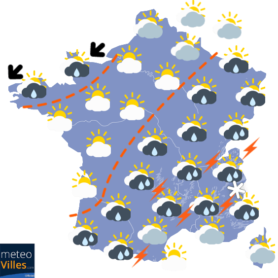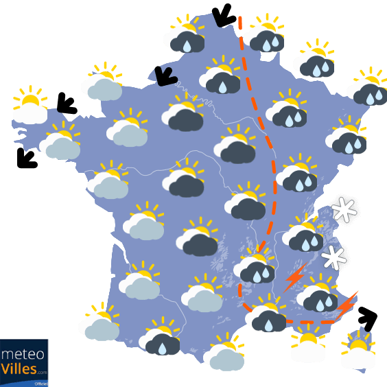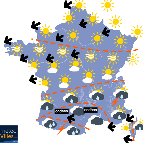 Cet écart entre Nord et Sud sera observé durant les journées de Lundi et Mardi, avec des minimales fraîches au Nord (restant hors gel grâce au vent), mais plus douces qu'au Sud en journée. Globalement, les conditions seront très ensoleillées notamment au Nord de la Loire alors qu'il faudra composer avec les nuages, la pluie et une fraîcheur diurne au Sud, notamment dans le Sud-Est.