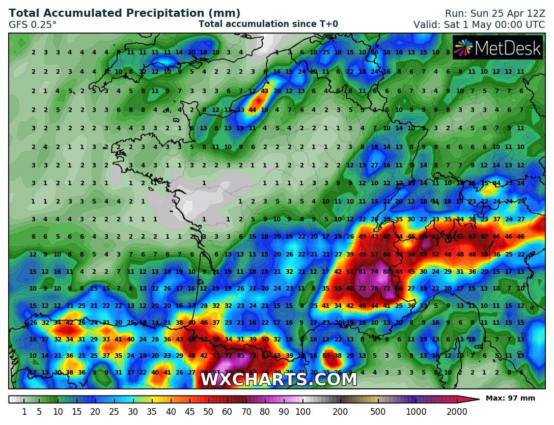 Précipitations attendues (en millimètres) durant la semaine prochaine en France - WXCharts