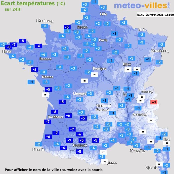 Évolution des températures entre le 24 et le 25 avril à 16h - Meteo-Villes