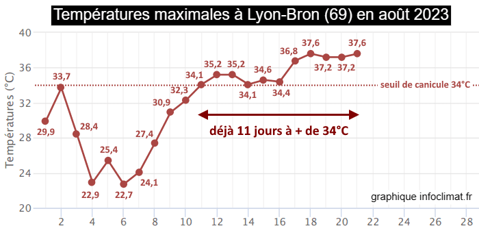 Températures maximales à Lyon-Bron (69) en août 2023 - graphique infoclimat.fr