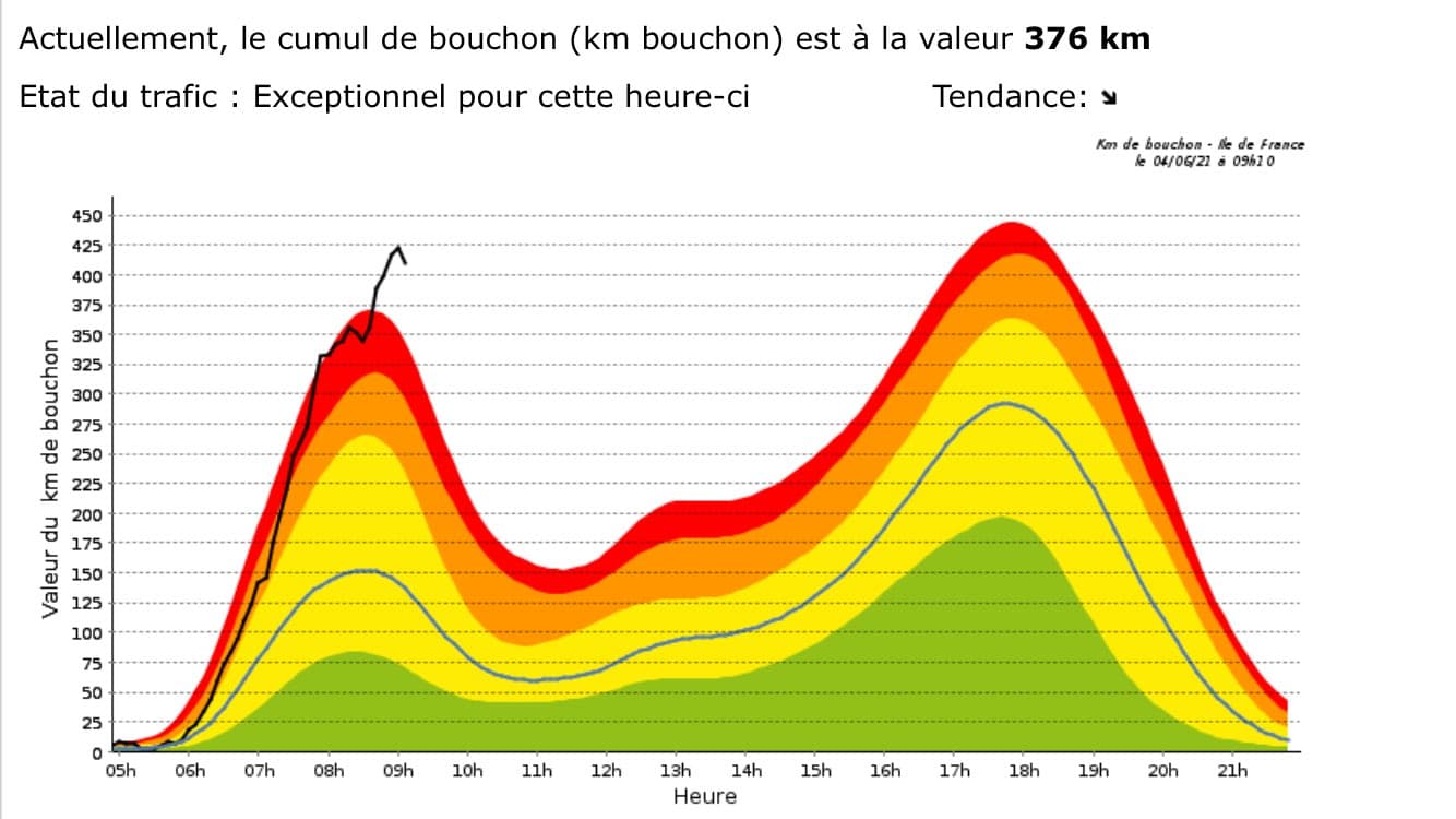 Au total, ce sont près de 425km de bouchons qui se sont accumulés sur l’Île-de-France en début de journée de ce vendredi 4 juin, une valeur exceptionnelle en raison de routes parfois difficiles et/ou inondées.